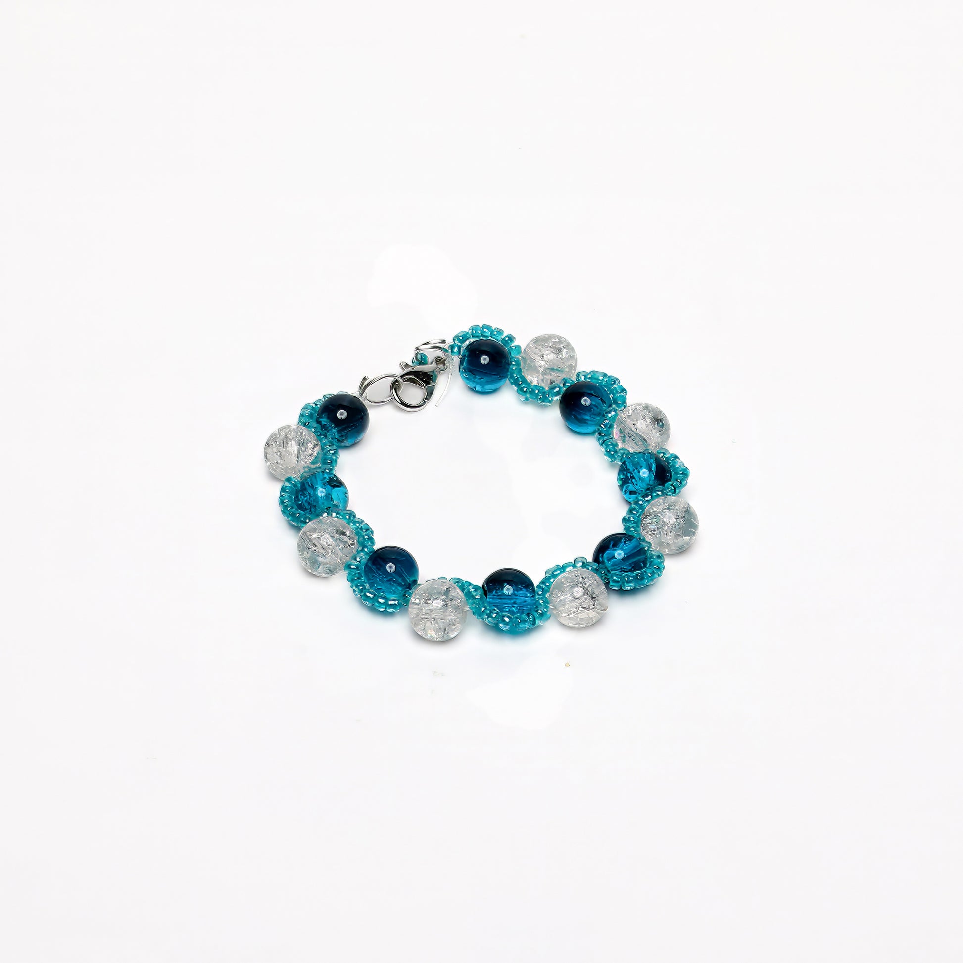 This Blue and Crystal Beaded Bracelet features a refreshing blend of deep blue, sky blue, and transparent crackle glass beads. Hand-strung with shimmering seed bead borders and finished with a silver-tone chain and clasp, it adds charm to both casual and formal outfits.